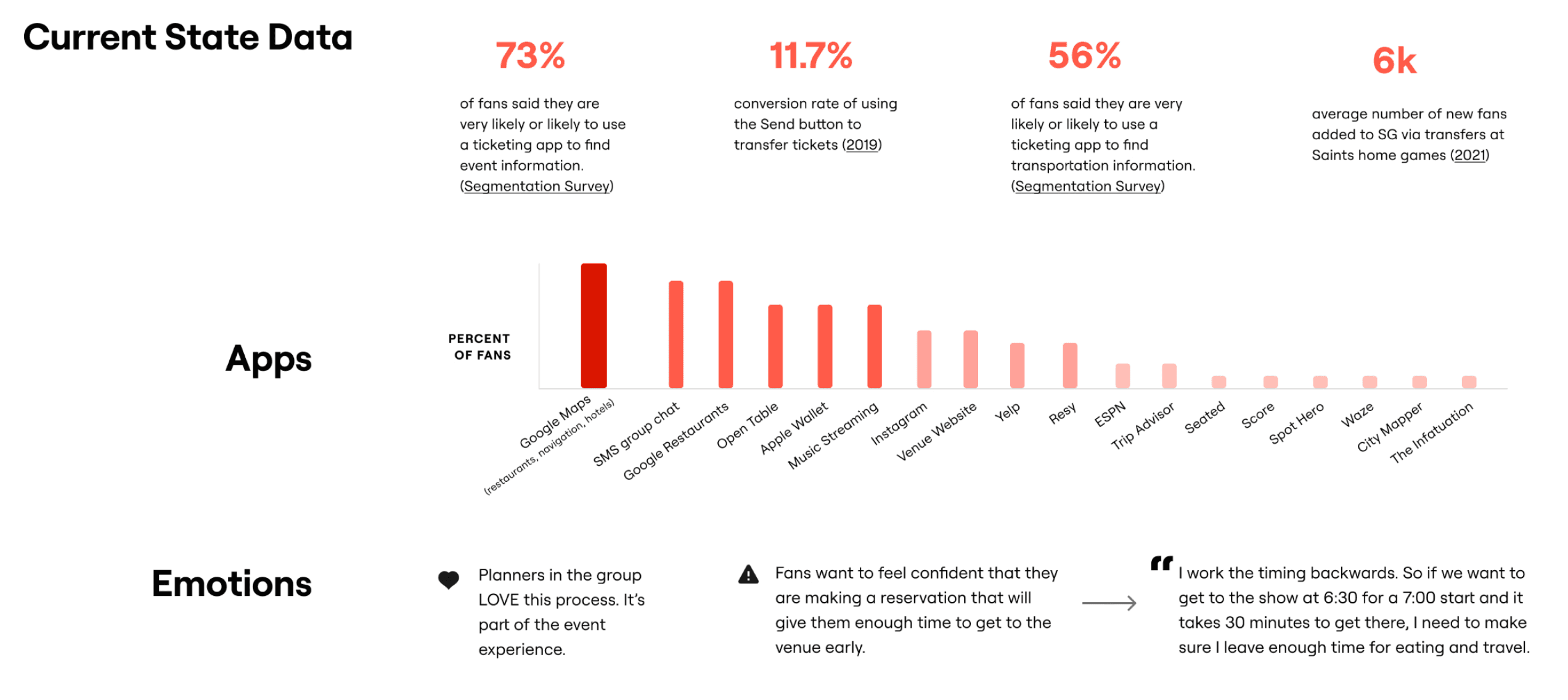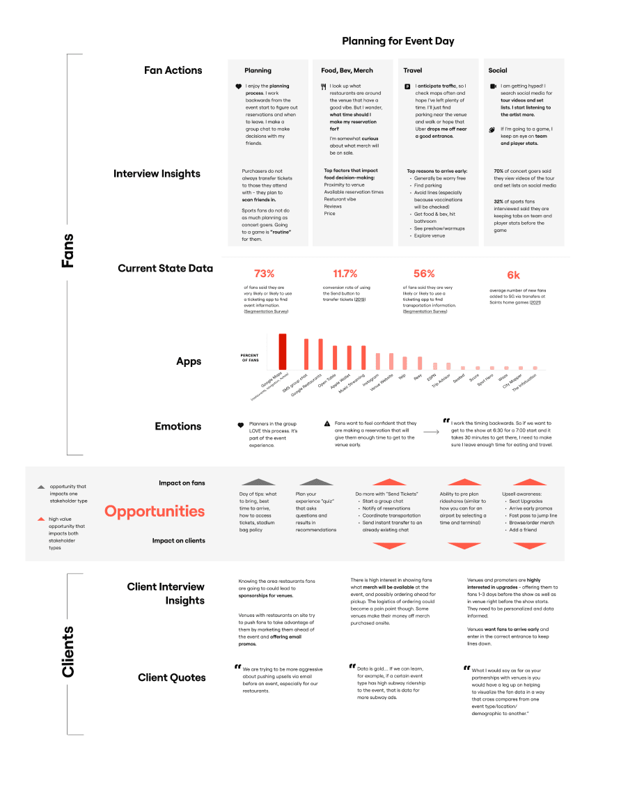 We found that fans invest significant time & energy into their pre-planning process, making important decisions such as when to arrive or whether to eat dinner at a venue. For some, planning was their favorite part of the experience! However, they lacked sufficient information about food or entertainment options, making it difficult to plan.