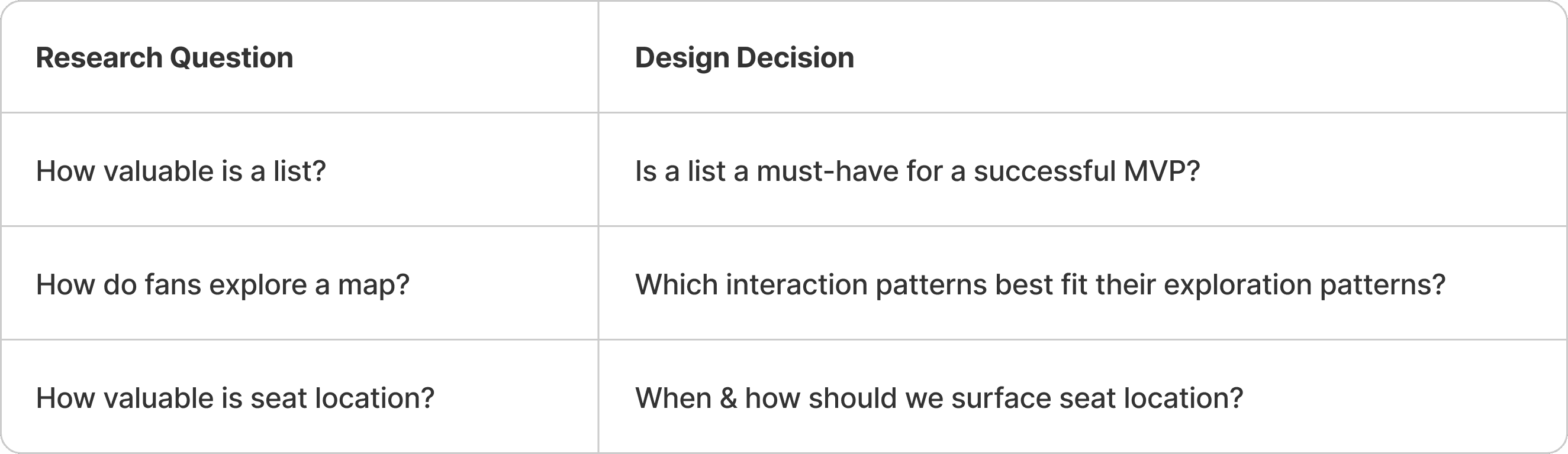 Existing venue maps delivered poor experiences; we knew that we had the technical capacity & unique data that would enable us to deliver valuable, customized map experiences to fans. Building a strong map experience would not only differentiate us from competition, but help solve critical client needs such as improving ingress operations and increasing in-venue spend.